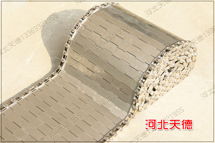 輸送鏈板的總寬度為1.3米,總長度為50米,采用2毫米的鋼板折彎加工而成,板與板之間的縫隙小于1毫米,所以放心塑料顆粒不會掉下去,每米鏈板上的輸送重量為50公斤,鏈條節距采用38.1毫米,串桿采用8毫米的支軸來支撐,不銹鋼網帶兩側安裝高2公分厚2毫米的擋邊用來防止塑料顆粒外漏,選用高質量的耐高溫耐磨損的304材質。河北天德絲網公司專業生產輸送鏈板、不銹鋼網帶、304板輸送帶、擋邊鏈板網帶以及定制型規格網帶。