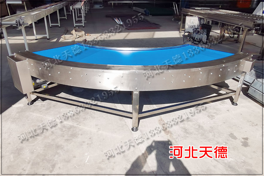 轉彎皮帶輸送機廣泛應用在食品、飲料、電子等行業,可以選用較小直徑的滾筒,使轉角連接方便,很好的解決過渡問題。