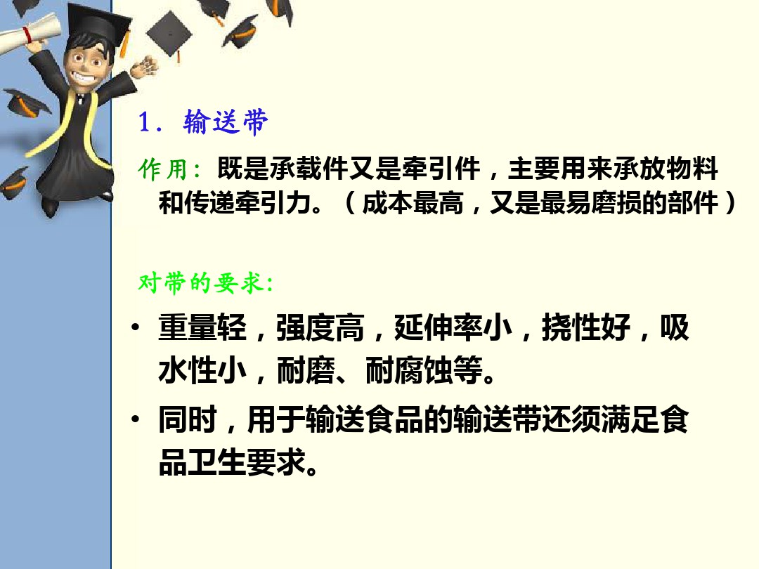 用于輸送食品的輸送帶還須滿足食 品衛(wèi)生要求。