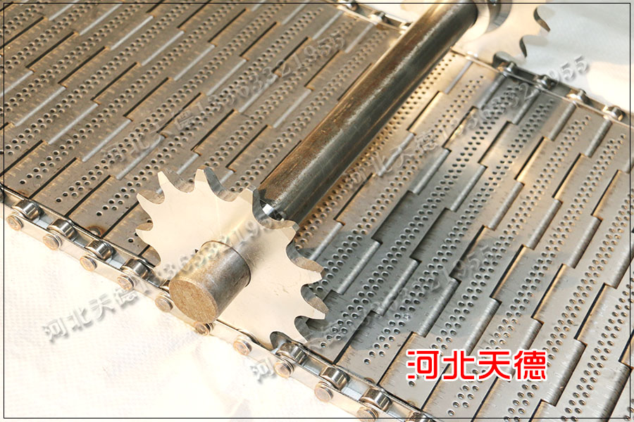 鏈板輸送網(wǎng)帶的總長度為22米,輸送距離為11米,客戶采用不銹鋼304材質(zhì)板材加工,表面打孔直徑5毫米。