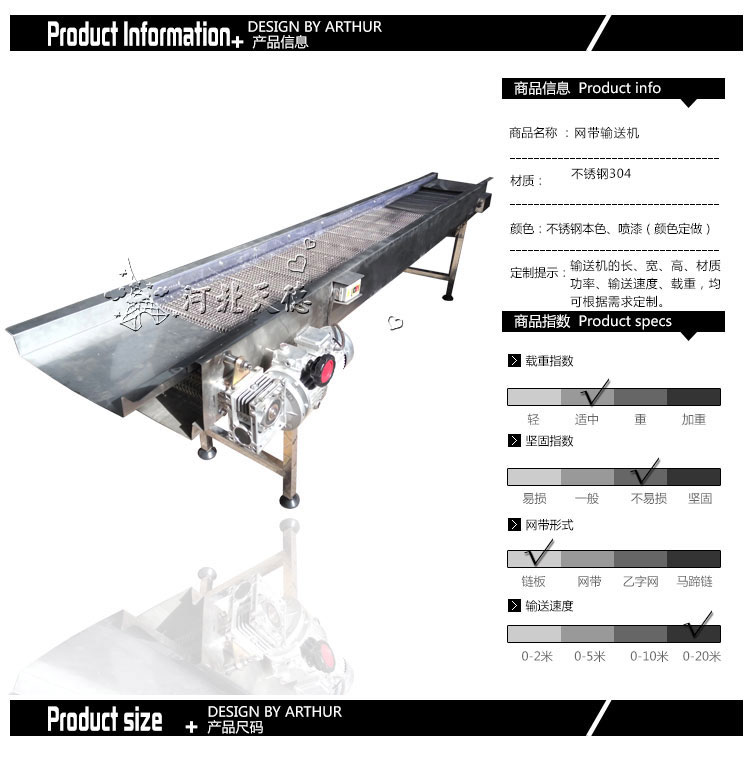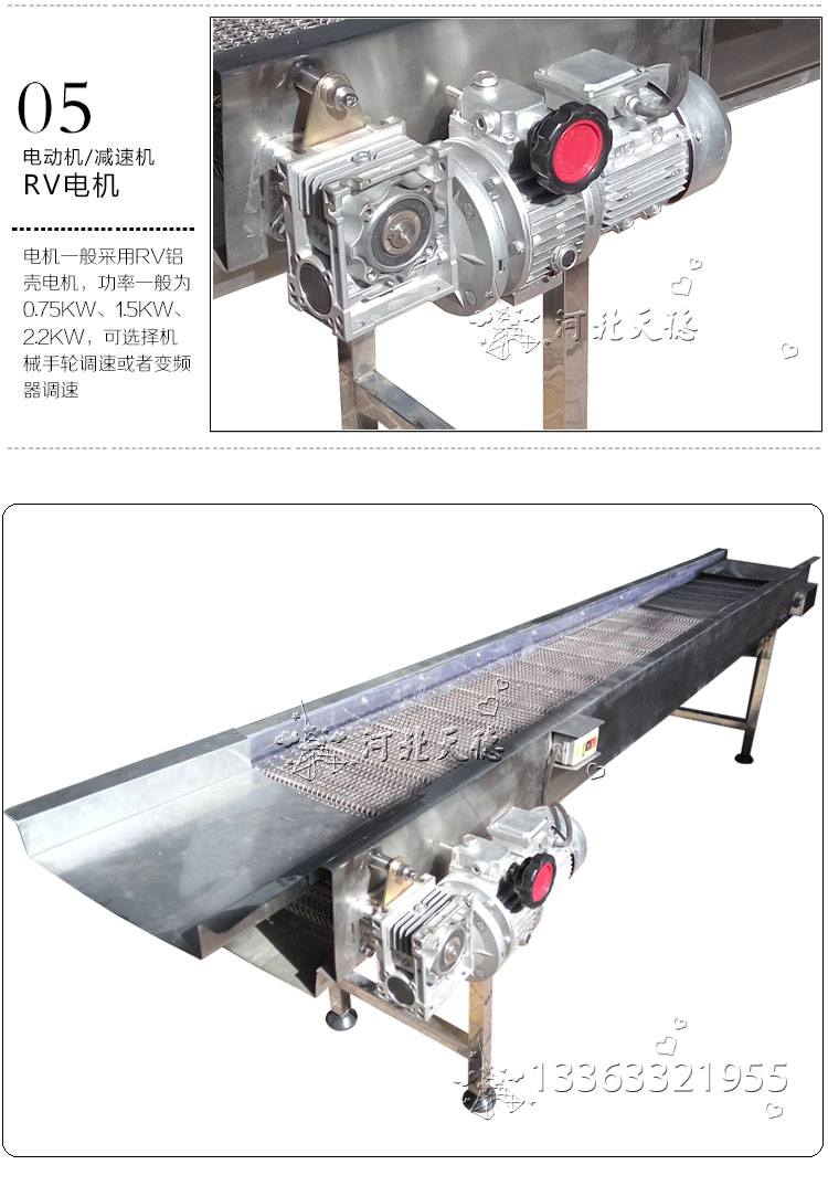設(shè)備特點: 網(wǎng)帶輸送機以不銹鋼網(wǎng)帶作牽引件輸送物料,運行平穩(wěn)、造型美觀、使用壽命長。