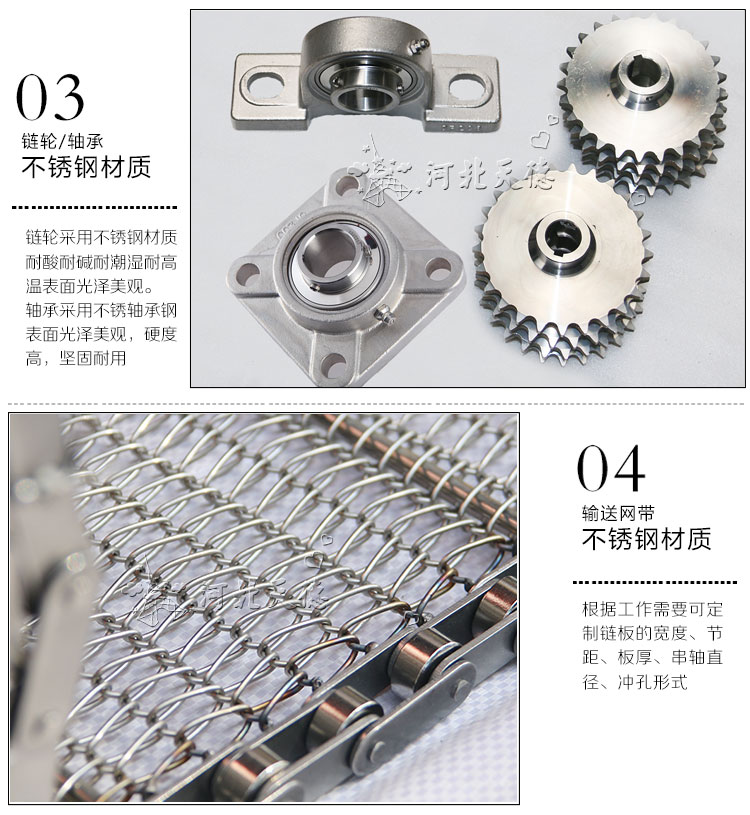 網(wǎng)帶輸送機主要用于物料的輸送,它采用不銹鋼制成的網(wǎng)帶作為載體運用輸送帶的連續(xù)或間歇運動來輸送各種輕重不同的物品,適用于各種食品行業(yè)的烘干、去濕、冷凍、清洗、熱處理,可輸送各種紙箱、包裝袋等單件重量不大的件貨,用途廣泛。 輸送帶的材質(zhì)為不銹鋼,因而其強度高,伸縮性小,不易變形,易保養(yǎng),而且衛(wèi)生、耐腐蝕或惡劣環(huán)境性較強,使用壽命長。適用于食品、副食品、冷凍水產(chǎn)品的加工生產(chǎn)線、包裝輸送線和電子配件的加熱、烘烤的輸送。也可用于制藥、日用化工等行業(yè)。
