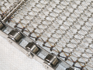 人字網輸送網帶由左右交替的網條通過四根直串條聯結而成,精密的編織技術使輸送網帶既具有密